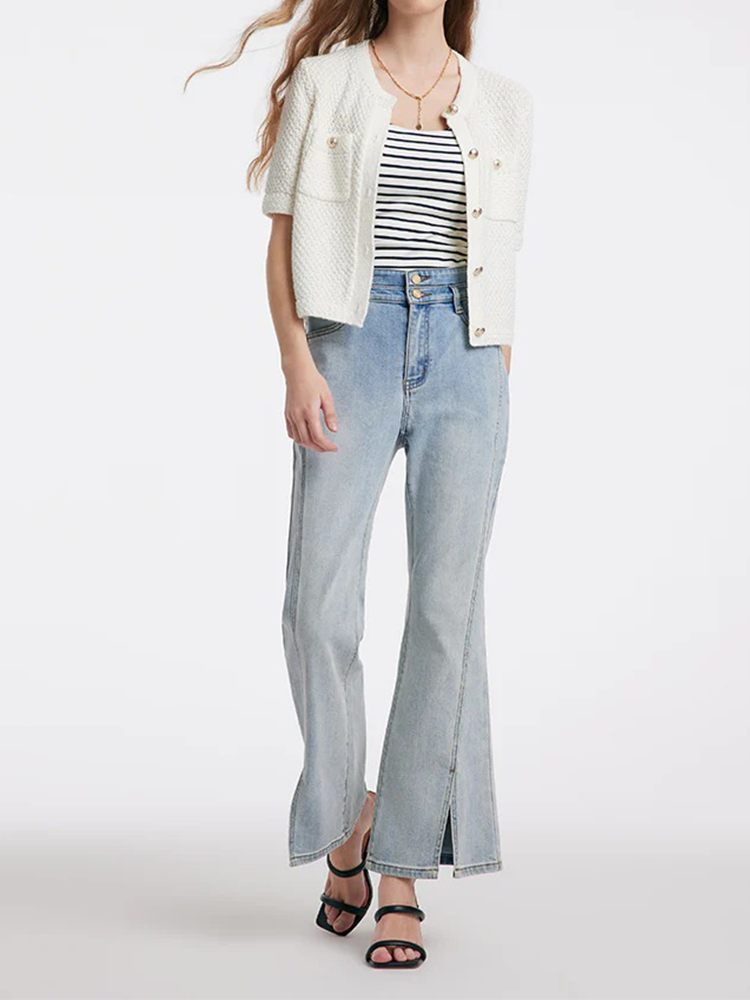 The knitted cardigan is designed in a popular tweed style, which is classic and timeless. The fit is loose and moderate, not too tight or too loose, making it easy to show an elegant temperament. It is made of high-quality cotton fabric, which is soft and comfortable, with good breathability, making it very comfortable to wear. It is very versatile and practical and can be worn with various inner layers and bottoms. The metal buttons add a touch of refinement.