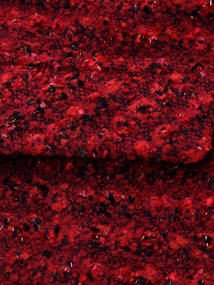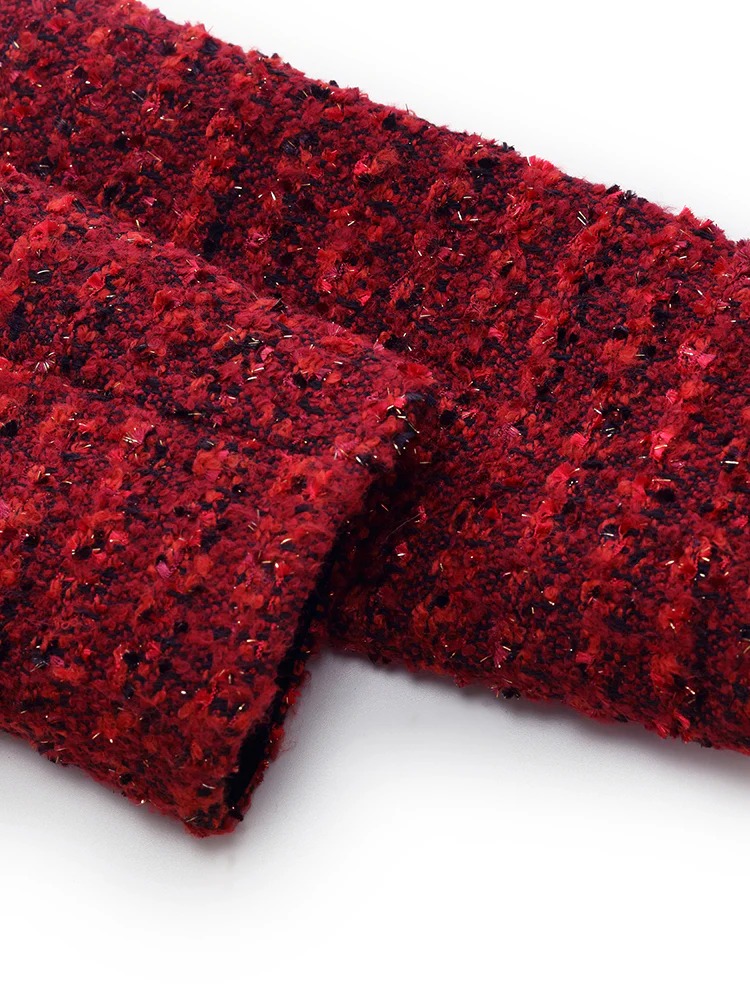 This wool-blend tweed jacket features interwoven colorful yarns, creating rich texture and depth. The cropped design elongates the legs, while structured tailoring ensures a sharp silhouette. Decorative pocket flaps add dimension, and metallic buttons bring a touch of luxury—perfect for Christmas, New Year, or wedding celebrations.
